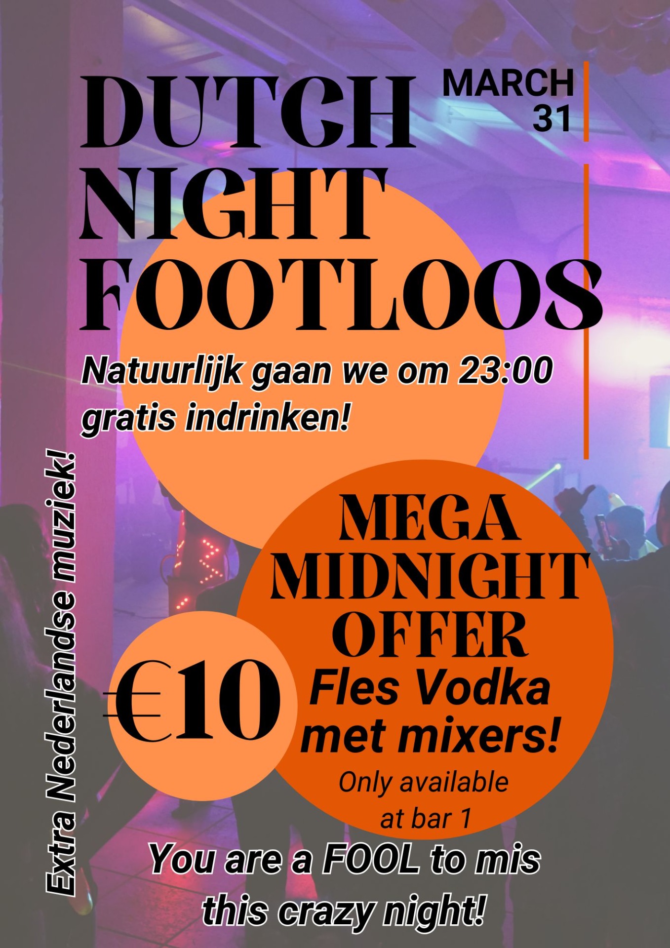 Het weer tijd voor de volgende MEGA Dutch Night in FootLoose! Naast extra veel Nederlandse muziek krijgen we om 23:00 uur een gratis fles om te delen (vast meer dan 1), zodat we de avond goed kunnen beginnen. En dan de MEGA deal om middernacht: Een fles vodka met mixers voor maar €10! Je bent toch geen FOOL als je deze gekke avond mist?