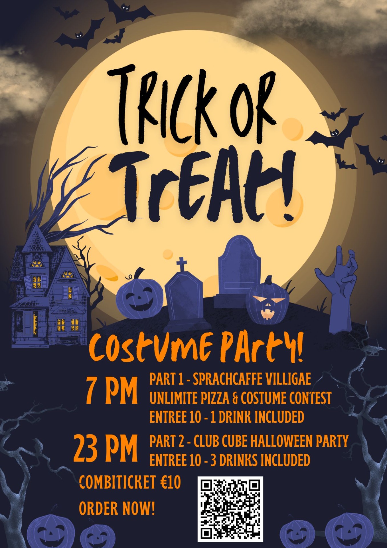Je begint bij de Sprachcaffe Beer Garden om 19:00, en na 23:00 ga je mee met de groep naar Club Cuba. Geen stress, geen extra kosten – gewoon non-stop Halloween plezier.